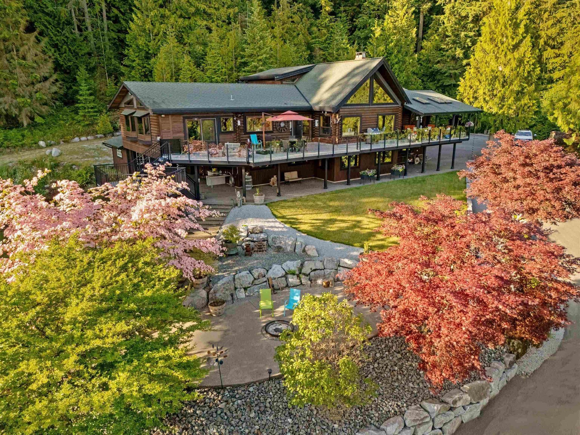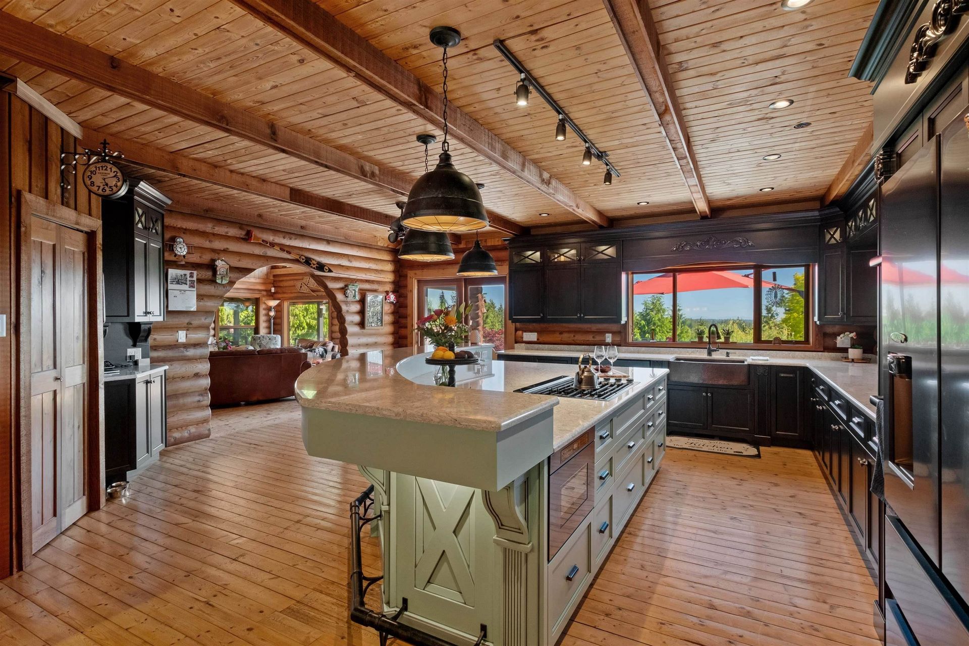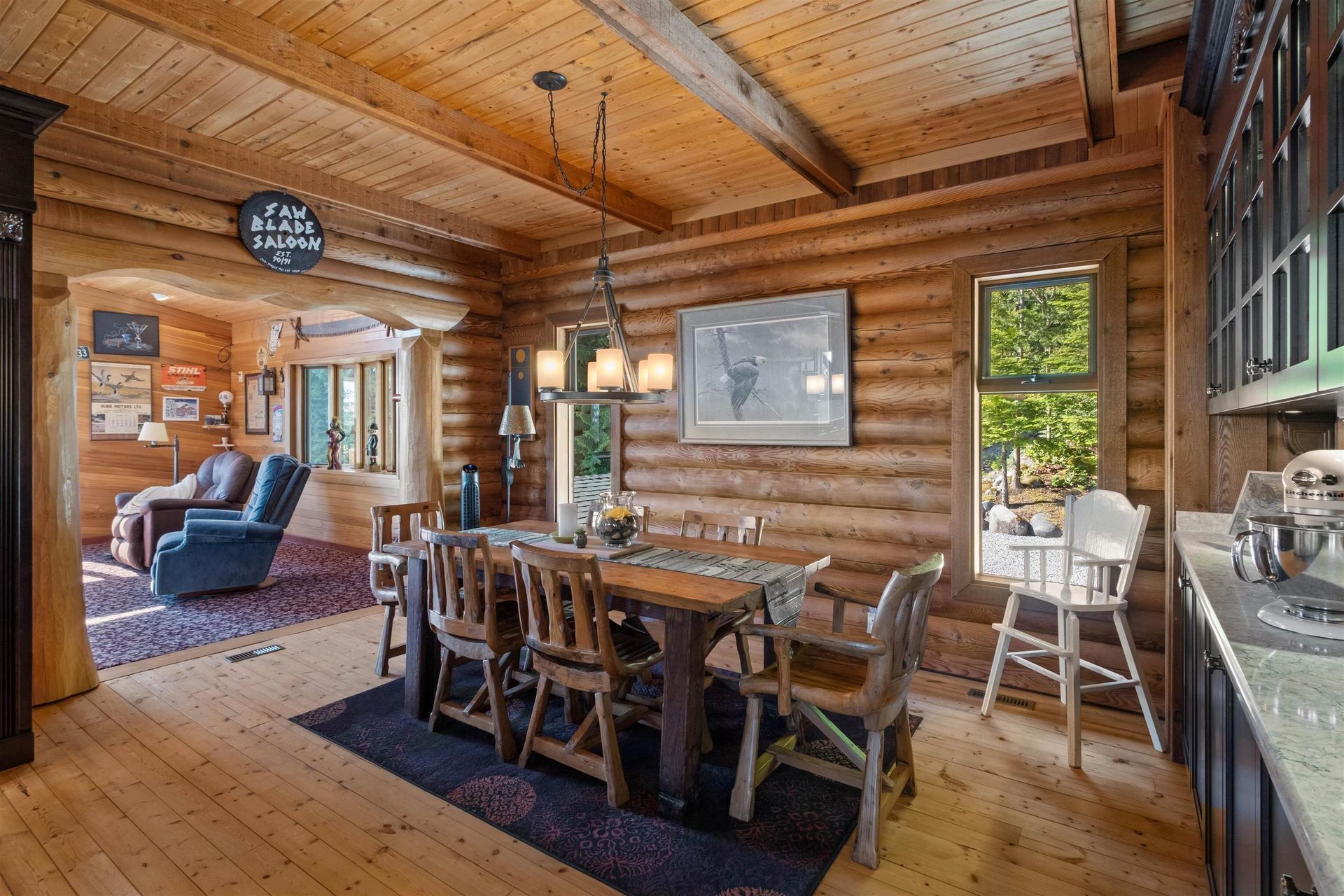 Welcome to your private paradise! This spectacular custom 4,188 sqft log home features 180 degree panoramic views while nestled on a sprawling 5.01 acres. Incredible wood work through out the home. Tons of natural sunlight into games room, kitchen and large living room with vaulted ceilings. Upgraded kitchen with pantry is an entertainers dream with Dacor appliances, an expansive island and a dedicated eating area. Primary bedroom is on the main floor with a walk-in closet and a spacious ensuite bathroom. In the basement, the laundry and 2 bedrooms with a full bathroom await as well as a spacious living room. The property also includes a 2,780 sqft detached heated garage with 3 bay doors with space for RV parking inside w/200amp service. Amazing outdoor lighting throughout the property.